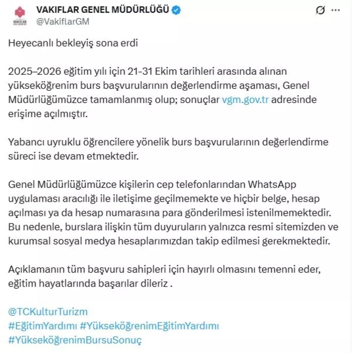 Kültür ve Turizm Bakanlığı Vakıflar Genel Müdürlüğü, 2025-2026 eğitim yılı için yükseköğrenim burs başvuru sonuçlarını duyurdu. Resmi web sitesi üzerinden erişime açılan sonuçlar hakkında detaylar paylaşıldı.
